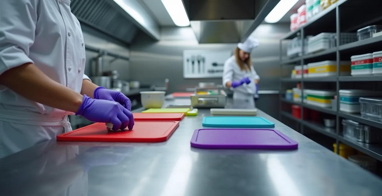L’utilisation d’un code couleur est la solution la plus efficace et la plus visuelle pour la brigade. La couleur violette est devenue le standard international pour le matériel dédié aux préparations sans allergènes. Disposer d’un kit complet (planche, couteaux, fouets, spatules) de couleur violette, utilisé exclusivement pour ces plats, élimine les hésitations et prévient les erreurs humaines durant le coup de feu. Ce matériel doit être stocké séparément et son processus de nettoyage et de désinfection doit être irréprochable.